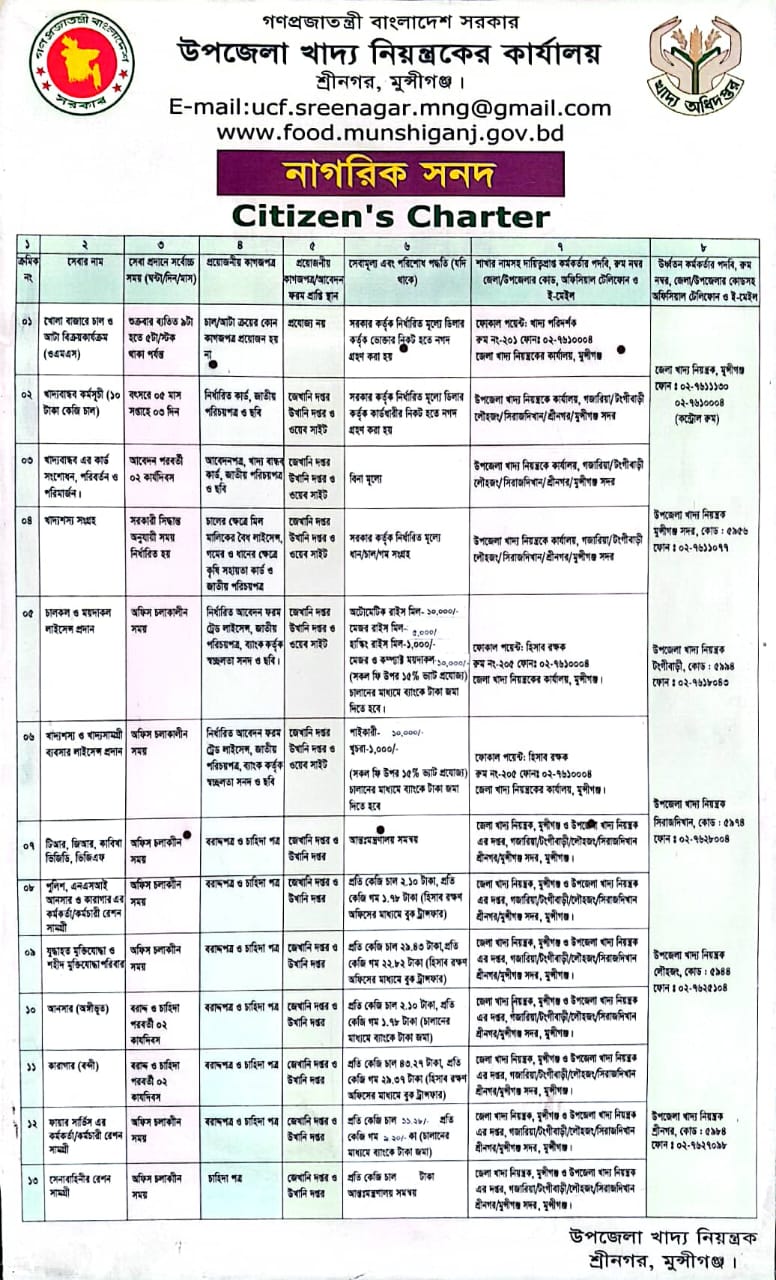 | ৪ | সংগৃহীত খাদ্যশস্যের মূল্য পুনর্ভরন | ৩ কার্যদিবস | ১. বিল ভাউচার ২. ইস্যুকৃত WQSC এর কপি | ভারপ্রাপ্ত কর্মকর্তার দপ্তর | বিনামূল্যে | নাম:মুহাম্মদ আলমগীর হোসেন পদবি: উপজেলা খাদ্য নিয়ন্ত্রক উপজেলা কোড::৮৪ ফোন নং:০২-৭৬২৭০৯৮ মোবাইল নং: ০১৭৪০-৫৯৪০৫৬ ইমেইল: ucf.sreenagar.mng@gmail.com | নাম: লিটন কুমার প্রামানিক পদবি: জেলা খাদ্য নিয়ন্ত্রক পরিচিতি নং -০২২৩০ জেলা কোড::৫৯ ফোন নং: ৯৯৭৬৬৩১১৩০ ইমেইল: dcf.mng@gmail.com |